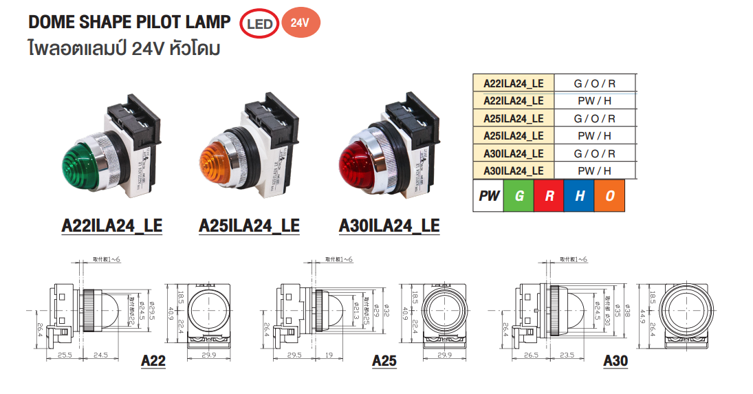 MARUYASU A22ILA24RLE ไพล็อตแลมป์หัวกลมสีเหลือง ไม่ผ่านหม้อแปลง 22 มม. LED 24 โวลต์